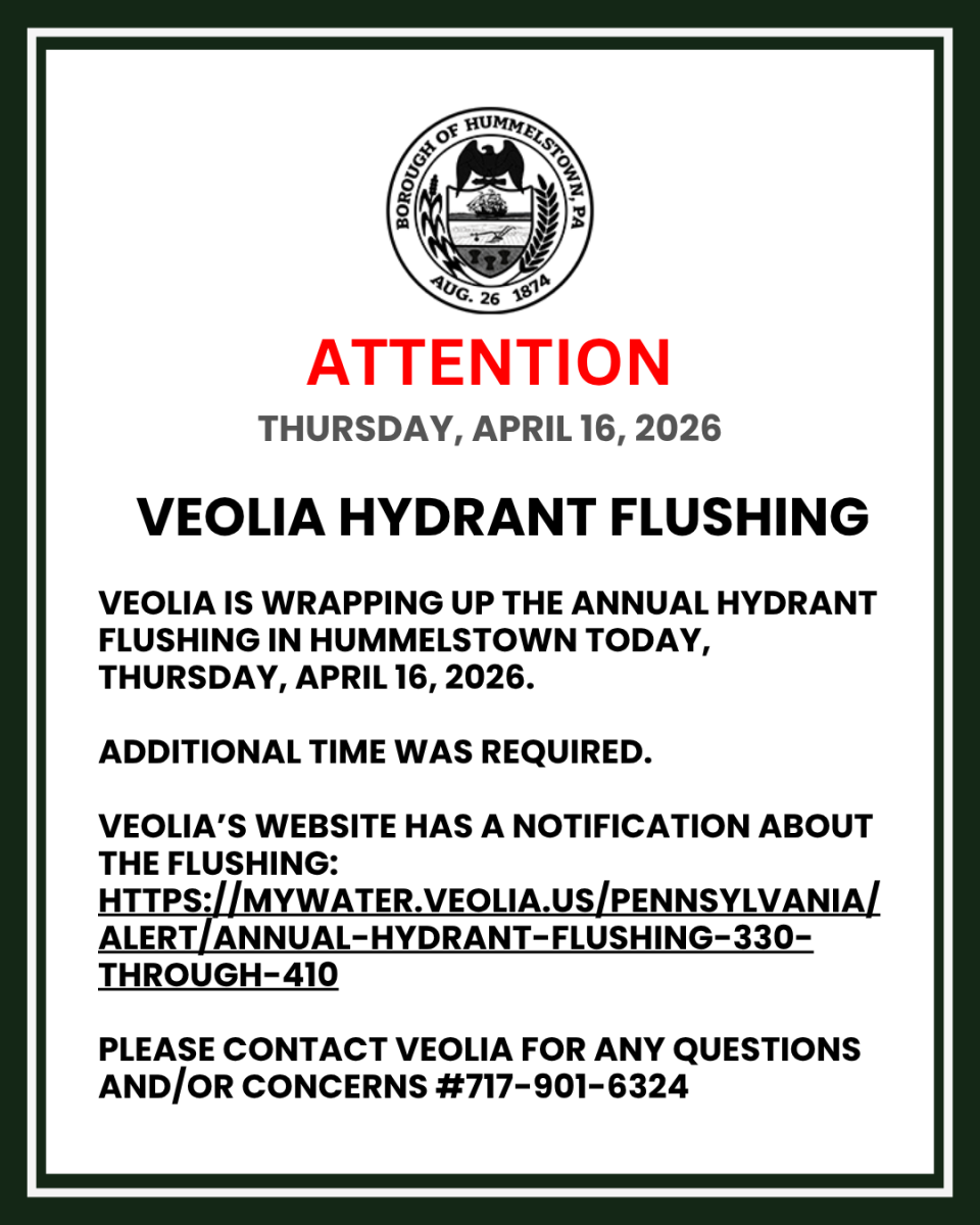 Veolia is wrapping up the annual hydrant flushing in Hummelstown today, Thursday, April 16, 2026.