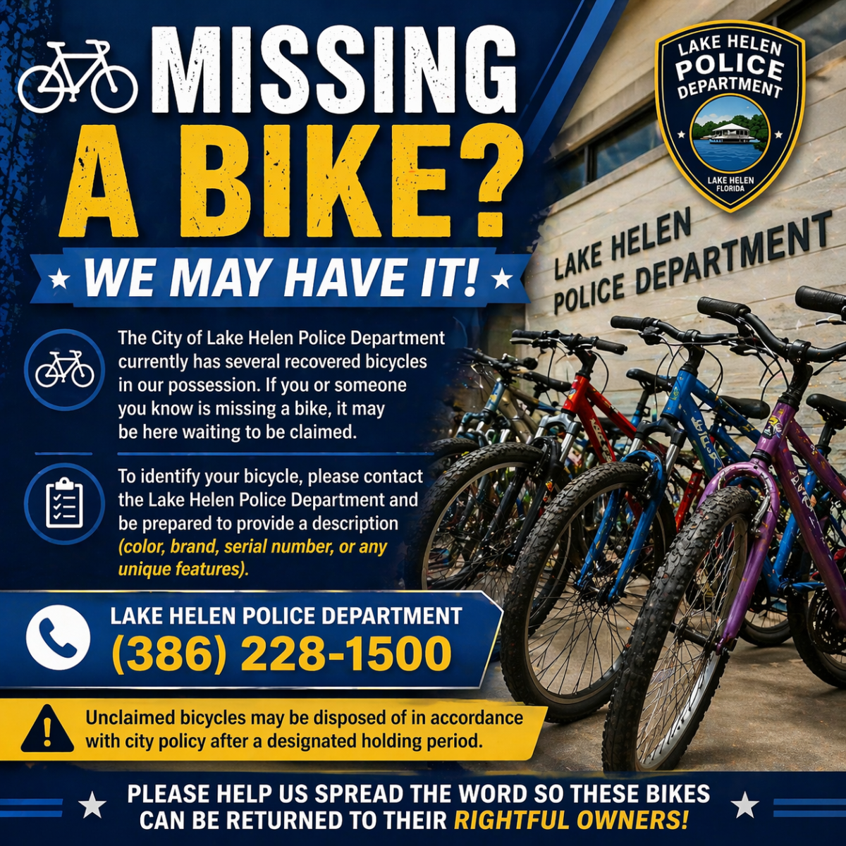 The City of Lake Helen Police Department currently has several recovered bicycles in our possession. If you or someone you know is missing a bike, it may be here waiting to be claimed.