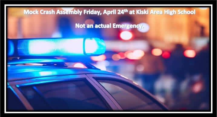 Please take note that a Mock Crash event will take place at Kiski Area High School. Please expect a large Police, Fire, and EMS Presence. The time frame will be Friday, April 24, 2026 from 8:30 to 10:30am.