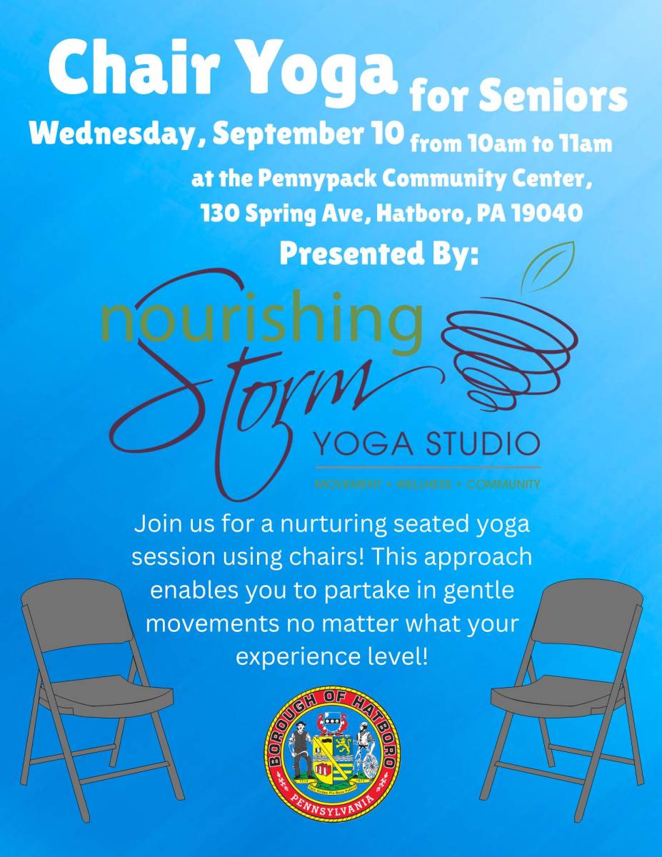 This approach enables you to partake in gentle movements that enhance flexibility, build strength, and increase your physical awareness of both body and mind, no matter what your experience level. The class will be guided by one of the talented instructors from NOURISHING STORM, a cherished studio located in the heart of Hatboro for the past 14 years. To Register please contact Rob at Borough Hall, 215-443-9100 or email rjacobus@myhatboro.org.
