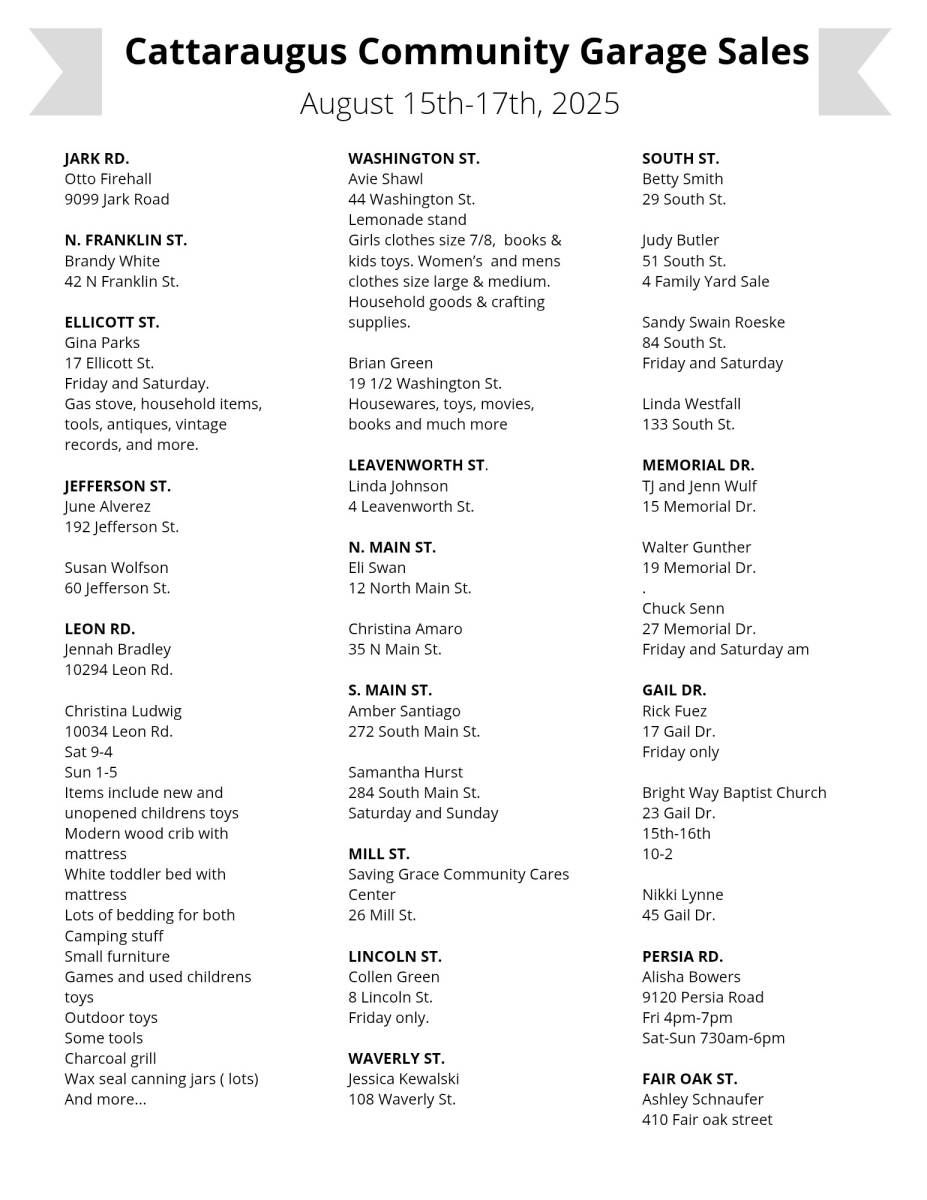 - Fri, Aug 8 @ 1:23pm - The event's attachment and description were changed. Message from Village of Cattaraugus: We have added the registered sale locations