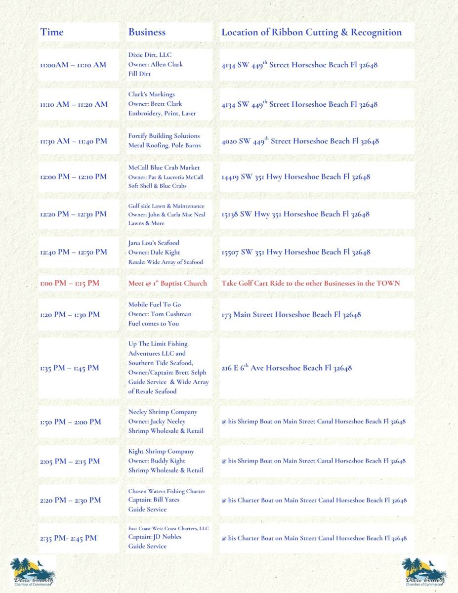 Friday, August 29, 2025 starting at 11:00 AM - 2:45 PM There will be Horseshoe Beach Ribbon Cutting and Business Recognition Day - SPONSORED BY Dixie County Chamber of Commerce