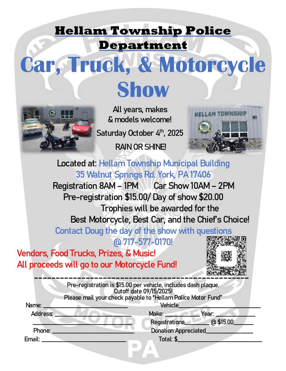 1st Annual Hellam Township Police Department Car, Truck, and Motorcycle Show!