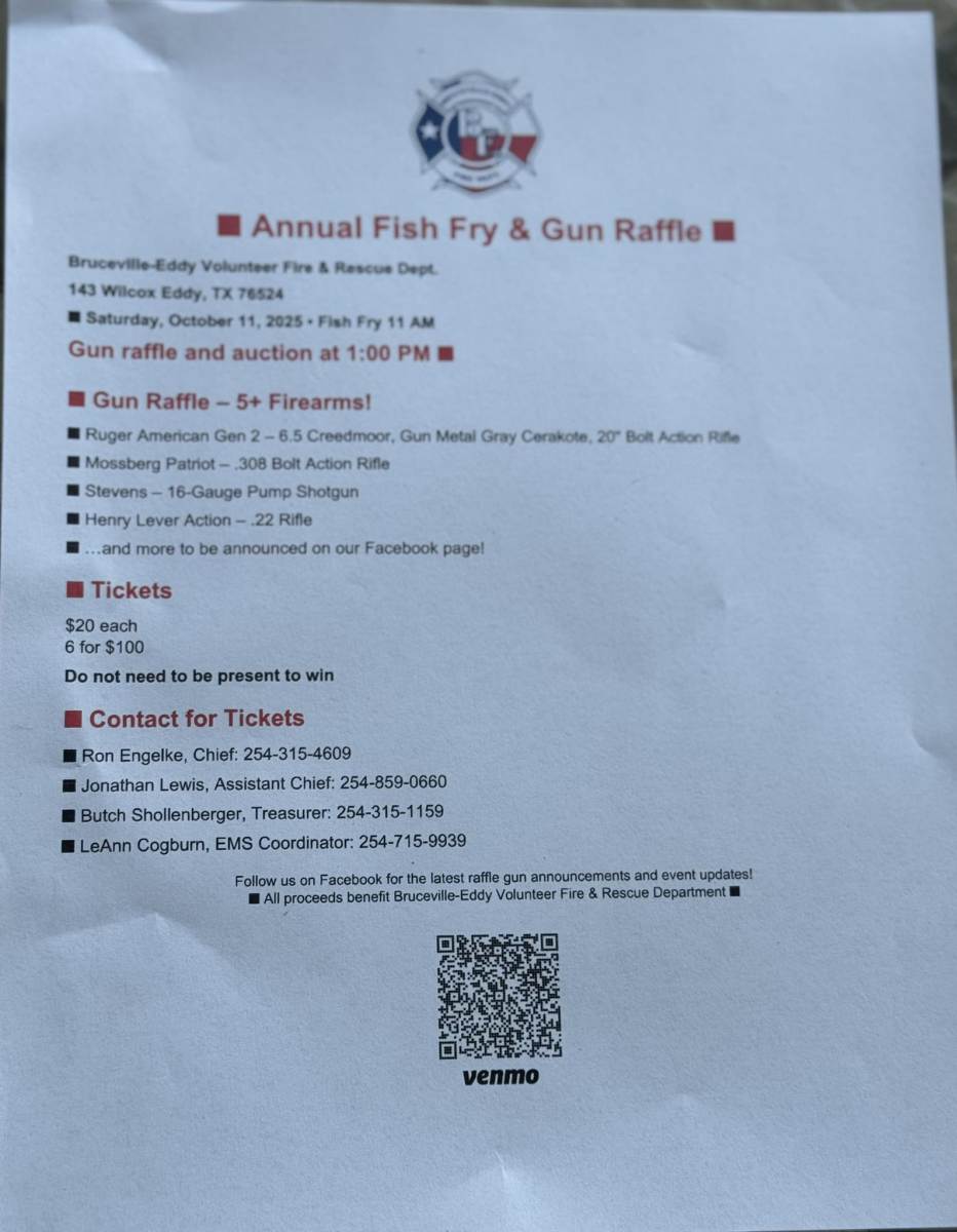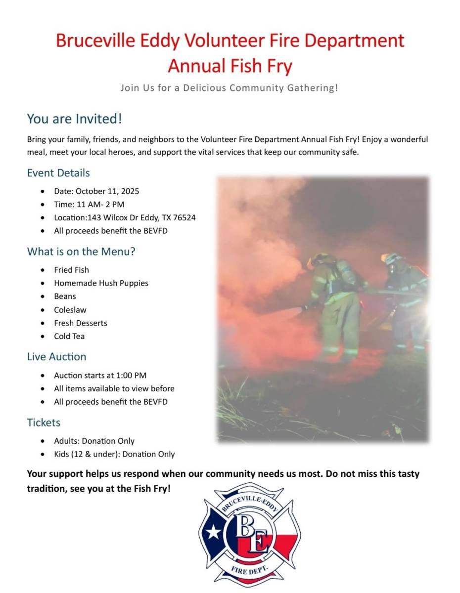 Event takes place at B-E fire station: 143 Wilcox Drive Eddy, Texas 76524