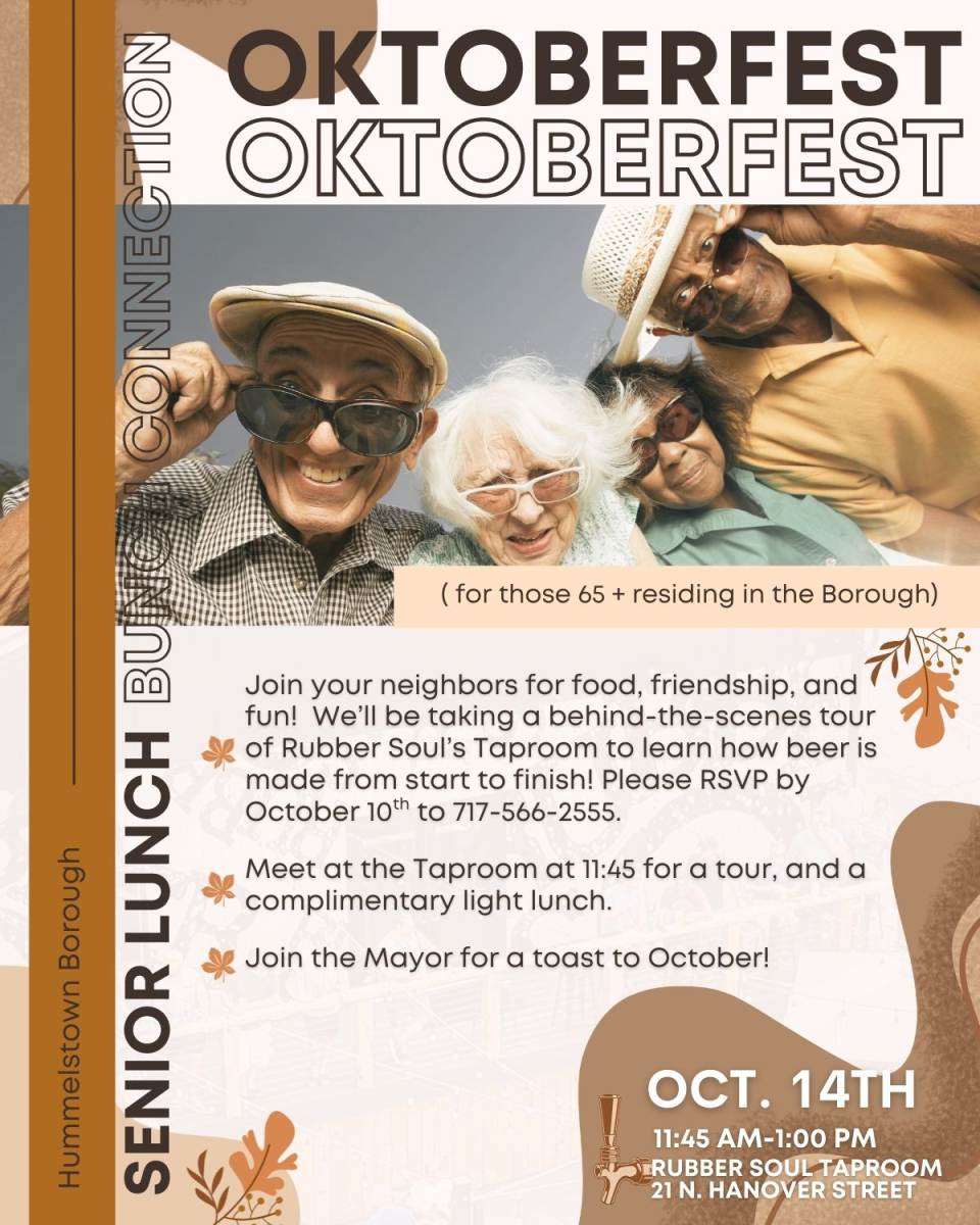 Senior Lunch Brunch will be held at Rubber Soul's Taproom! Please call #717-566-2555 to RSVP by October 10th!