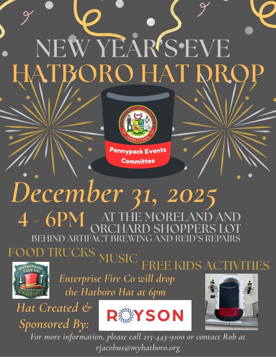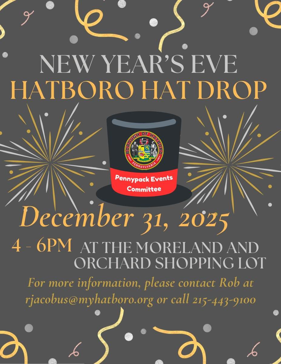 For the first time ever, the Borough of Hatboro will be hosting a special Hatboro Hat Drop event to celebrate the end of 2025 and the beginning of 2026! This exciting event will be taking place in the Moreland and Orchard Shoppers Lot (located behind Artifact Brewing and Reid Repairs at 2 S. York Road)