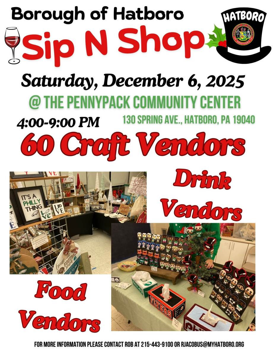 Join the Pennypack Events Committee for the annual Holiday Sip N Shop on Saturday, December 6, 2025. This event is taking place at the Pennypack Community Center, 130 Spring Avenue, Hatboro, PA 19040 from 4 PM to 9 PM.
