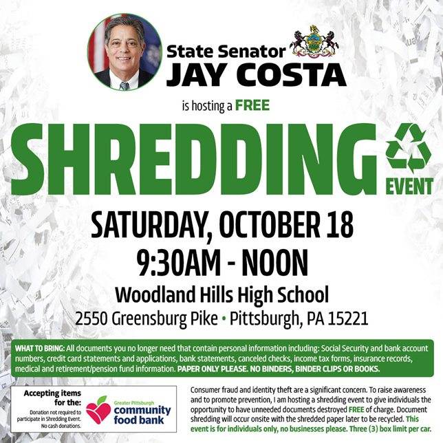 Free Shredding Event hosted by Senator Jay Costa at Woodland Hills High School, Saturday, October 18, 9:30 am - 12:00 pm. There is no need to RSVP to this event. Just show up with your sensitive documents, and they’ll take care of the rest. For questions or more information, please call Senator Costa's office at 412-241-6690.