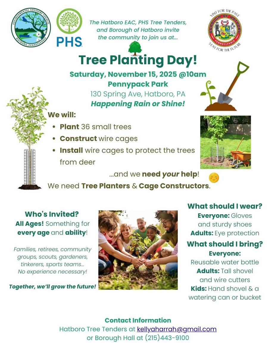 The Hatboro Environmental Advisory Council and Hatboro Tree Tenders Group are holding a Tree Planting Day on November 15, 2025 beginning at 10 AM in Pennypack Park (130 Spring Avenue, Hatboro, PA 19040).