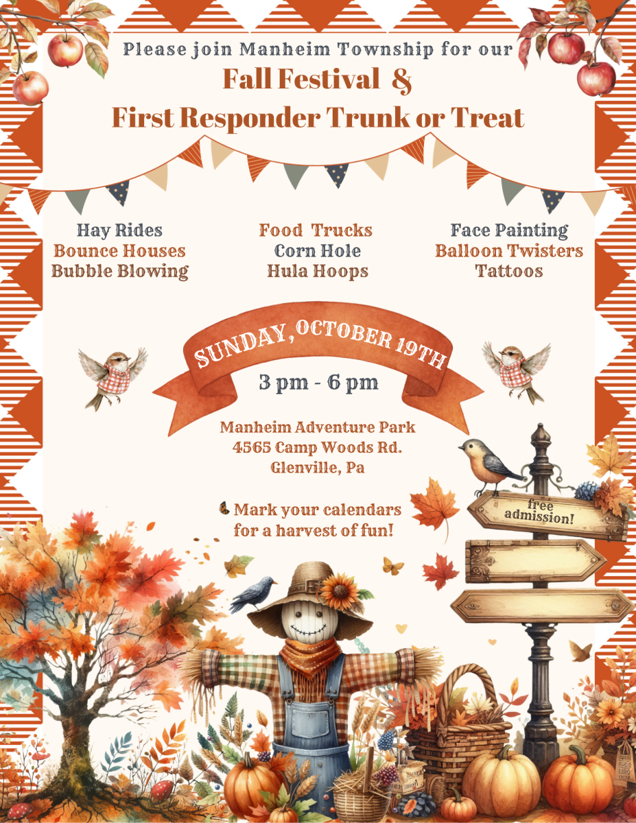 Please join Manheim Township for our Fall Festival & First Responder Trunk or Treat! This event is free to attend and is being held on Sunday, October 19th from 3 pm to 6 pm at our Manheim Adventure Park. Come enjoy hay rides, bounce houses, bubble blowing, corn hole, pumpkin bowling, hula hoops, face painting, balloon twisters & tattoos. We will have Food Adventures Food Truck, Auntie Anne's Pretzels Food Truck, Kona Ice and Tom's Coffee Truck.