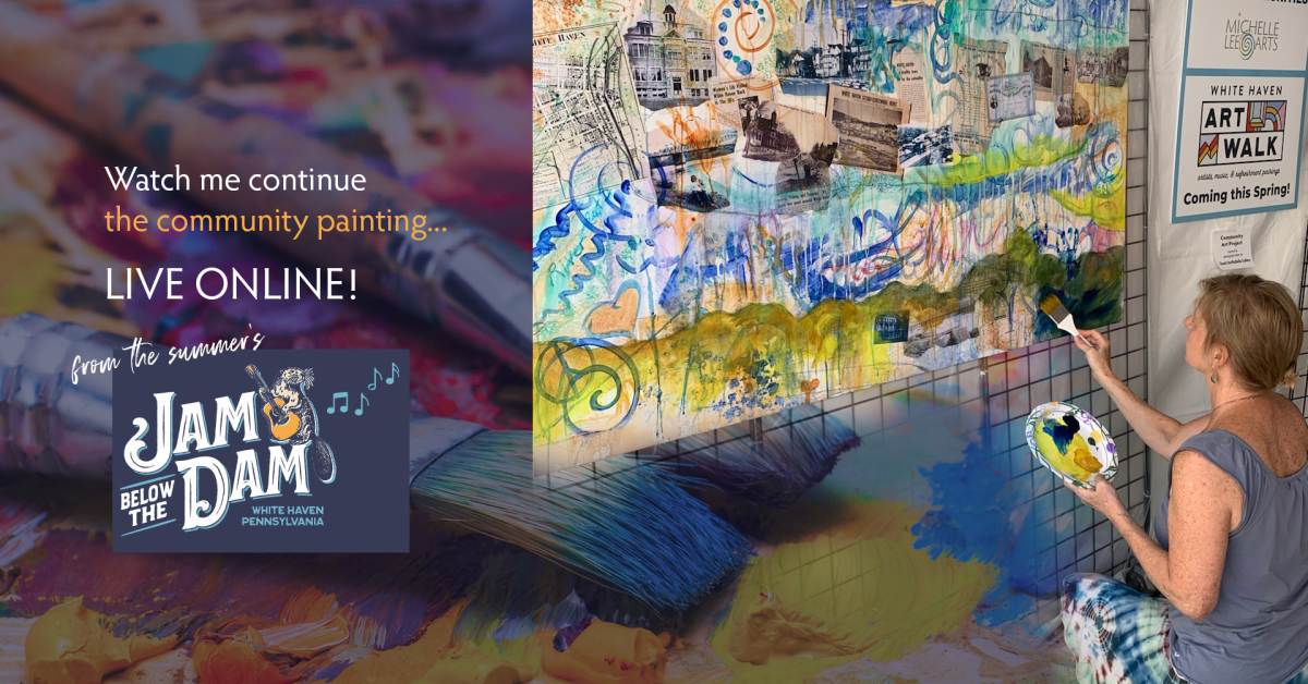 Watch me paint live online as I continue on this Community Paint Project for the town of White Haven, PA. The project was a collaboration with adults and kids at the town's July block party, and is now back in the studio to refine and finish for the big reveal in November.