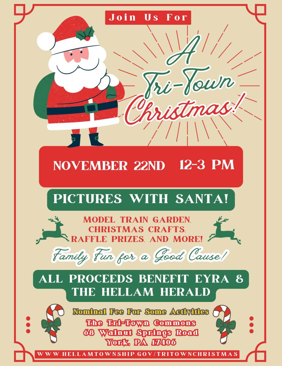 Join us for "A Tri-Town Christmas!" Tons of family-friendly fun, including pictures with Santa, a model train garden, Christmas crafts, raffle prizes, holiday-themed concessions and more! Now only $5 per child! A portion of the proceeds will benefit the Eastern York Recreation Authority and The Hellam Herald. The event is being held at The Tri-Town Commons, located at 68 Walnut Springs Road York, PA 17406, from noon until 3PM, November 22nd. Just in time for those family holiday photos. We Ho, Ho, Hope to see you there!