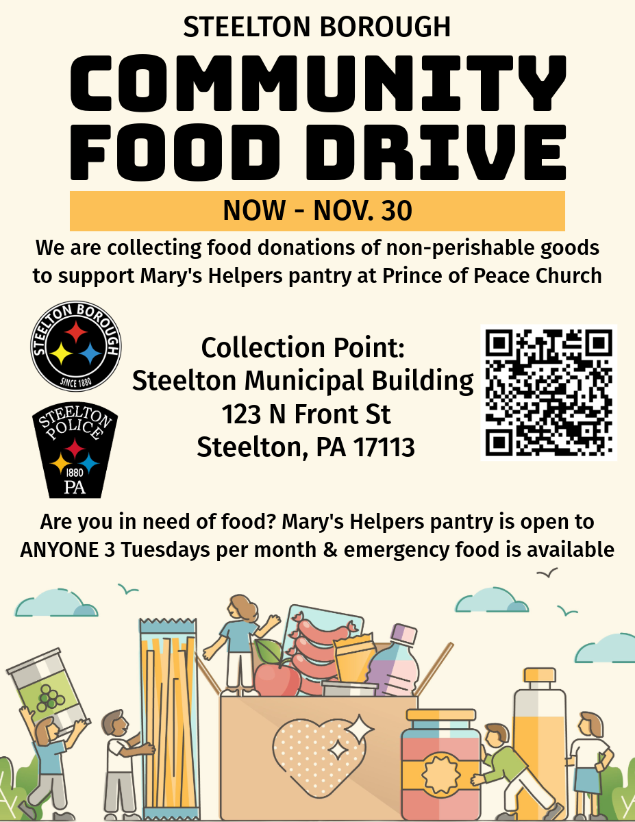 The Borough of Steelton and its Police Department is hosting a food drive starting now until November 30, 2025. We are collecting non-perishable goods to support Mary's Helpers food pantry at Prince of Peace Church, located at 815 South 2nd Street. The collection point will be at the Steelton Borough Municipal Building, located at 123 North Front Street.