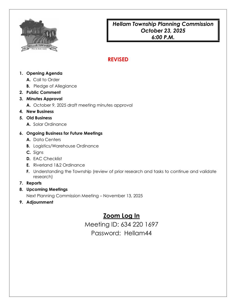 - Thu, Oct 23 @ 6:04pm - The event's attachment and description were changed. Message from Hellam Township: The next Planning Commission meeting date has been corrected on this revised agenda.