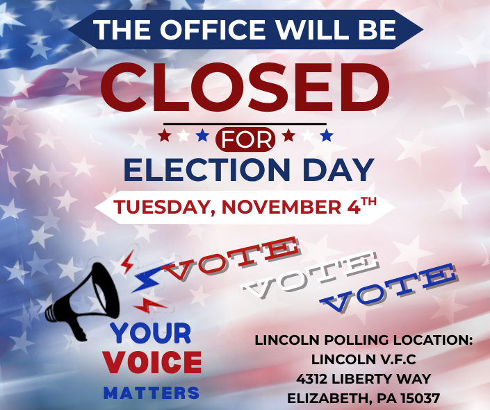 Please be advised that our office will be closed on Tuesday, November 4th in observance of Election Day.