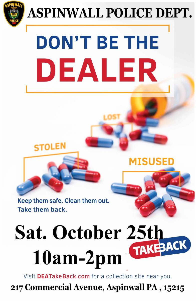 Unneeded prescription medication–those that are old, unwanted, or no longer needed – are a public safety issue, too often becoming a gateway to addiction. The majority of opioid addictions start with prescription pills found in medicine cabinets at home. Pharmaceutical drugs can be just as dangerous as street drugs when taken without a prescription or a doctor’s supervision. A majority of people who misuse a prescription medication obtained the medicine from a family member or friend. Prescription Drug Take Back Day events are one way to dispose of unneeded medications. Drop of Medications at Aspinwall Borough Building.