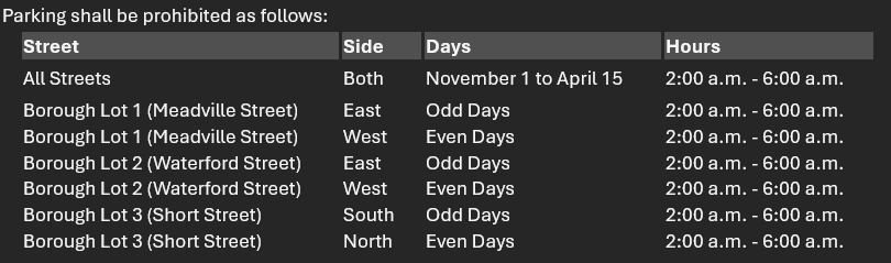 The Edinboro Police Department will begin enforcing Winter Parking Regulation at 2:00 A.M. on Saturday, November 1, 2025.
