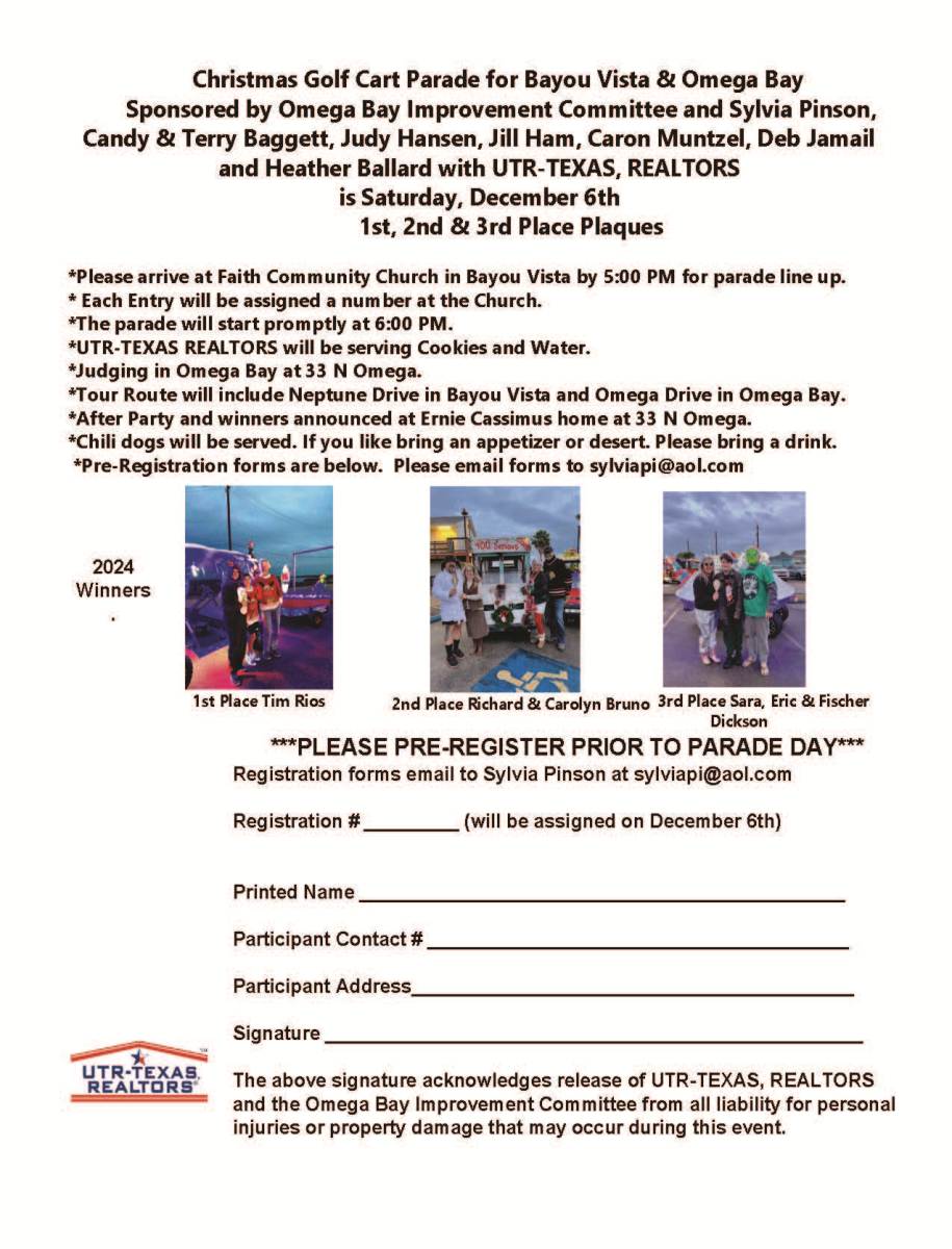 Sponsored by Omega Bay Improvement Committee and Sylvia Pinson, Candy & Terry Baggett, Judy Hansen, Jill Ham, Caron Muntzel, Deb Jamail and Heather Ballard with UTR-TEXAS REALTORS