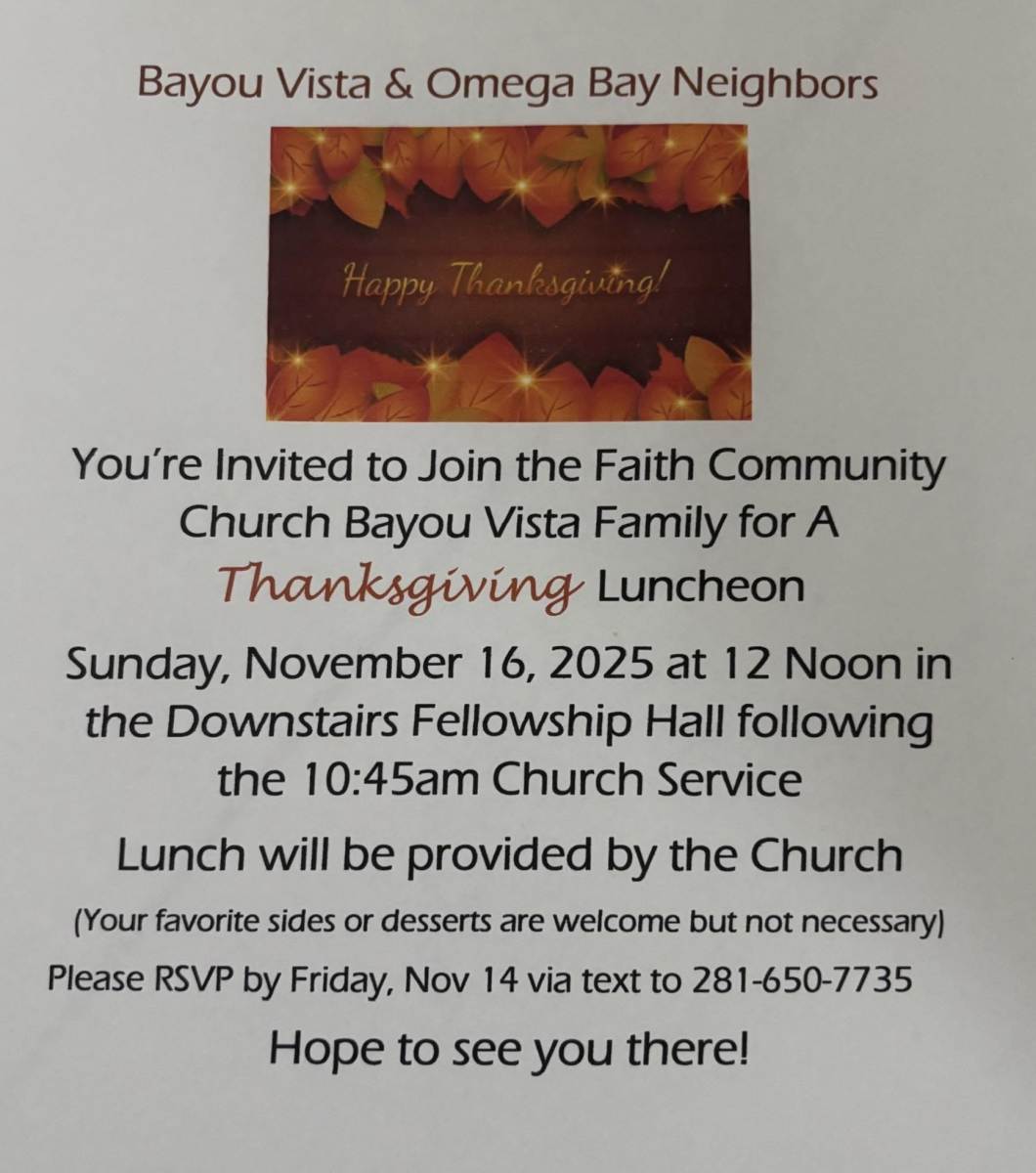 You're Invited to Join the Faith Community Church Bayou Vista Family for A Thanksgiving Luncheon.