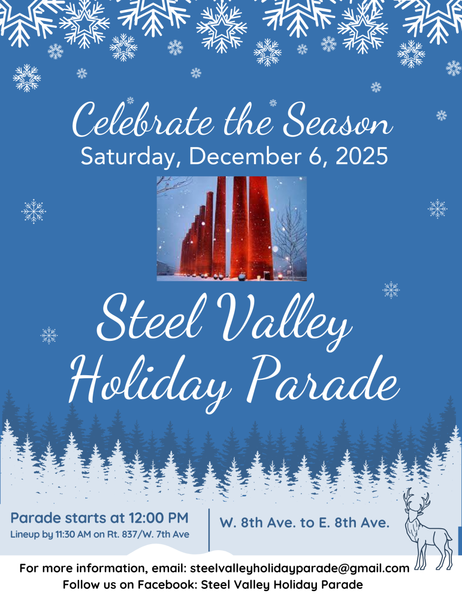 Steel Valley Holiday Parade on Saturday December 6th starting at 12:00pm, from W. 8th Ave. to E. 8th Ave.!!
