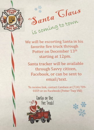 We will be escorting Santa in his favorite fire truck through Potter on December 13th starting at 12pm.