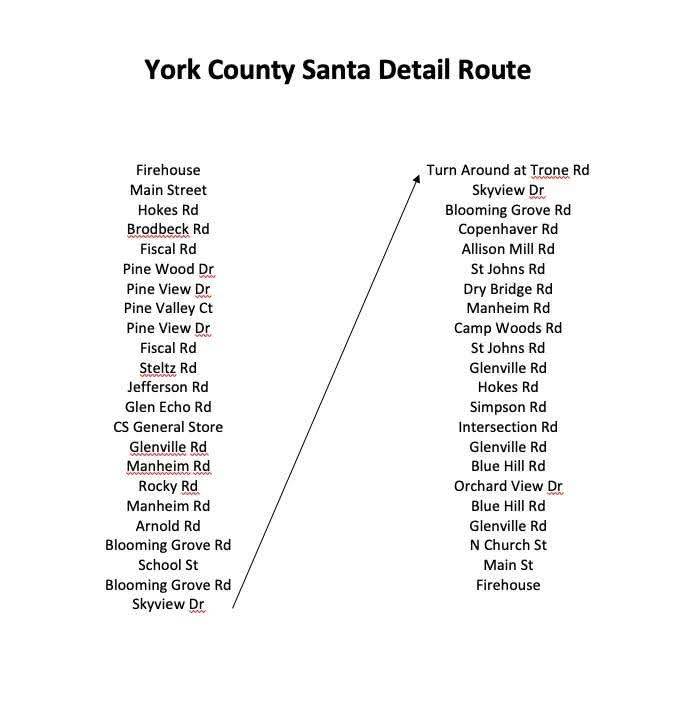 Santa plans to leave the firehouse Sunday December 14th at 3PM to visit our Carroll County area, and Sunday December 21st at 3PM to visit our York County area.