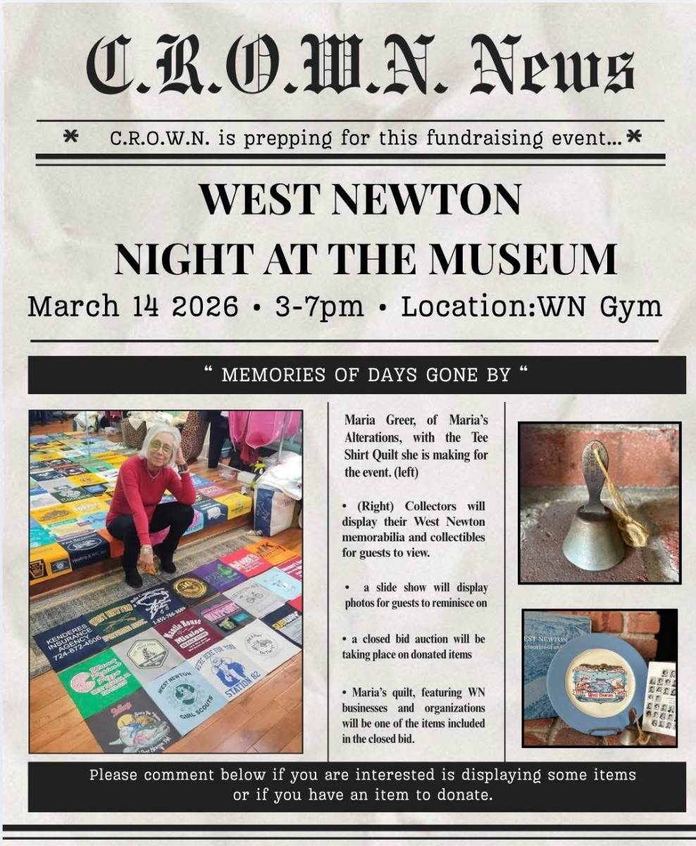CROWN is prepping for West Newton Night At The Museum. Please contact Debbie at 724-972-1937 if you are interested in displaying some items or donating an item for the auction.