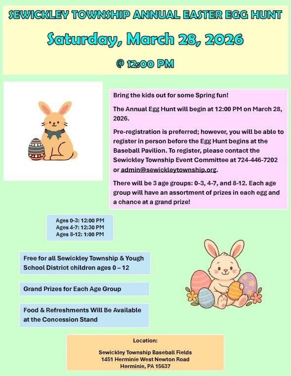 The Sewickley Township Event Committee will be hosting the Annual Easter Egg Hunt on Saturday, March 28, 2026 @ 12:00 PM.