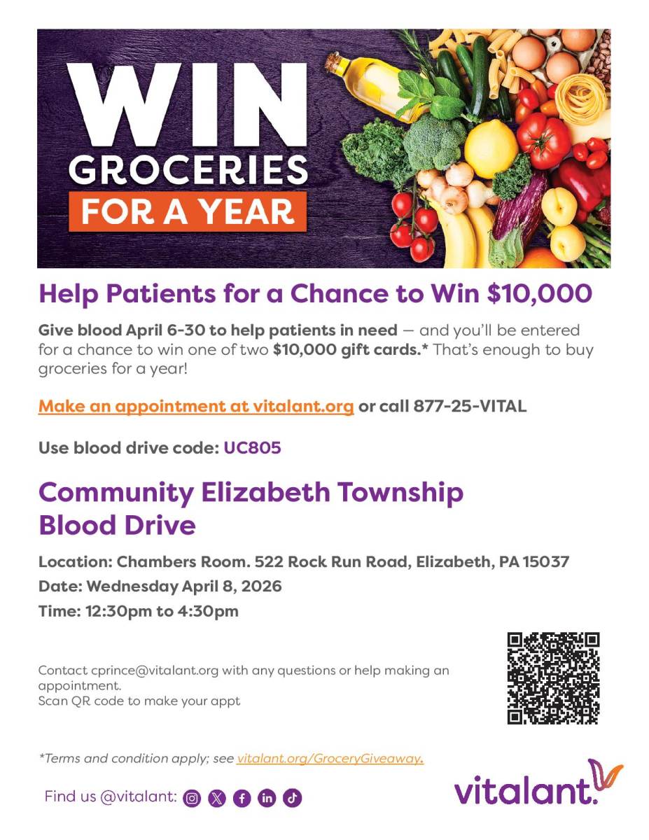 Join us in saving lives on April 8th, 2026 from 12:30pm - 4:30pm at the Elizabeth Township Municipal Building by donating blood!