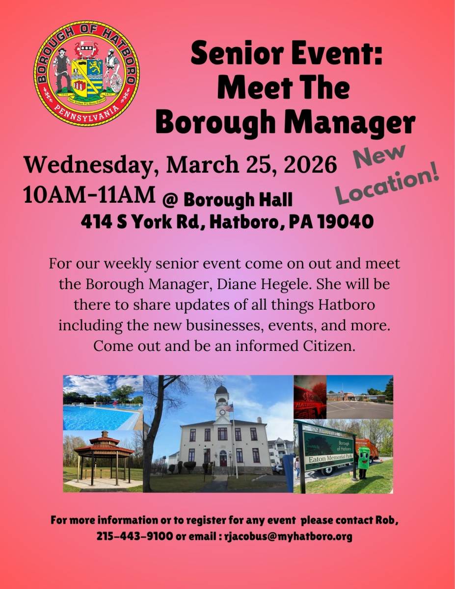 This event will give seniors the opportunity to meet the Borough Manager, ask questions, and learn about many projects, events, and more going on in Hatboro in an informal setting.