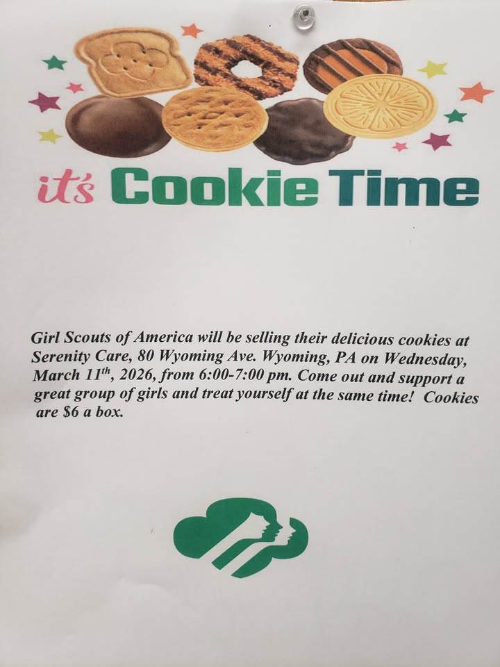 The Girl Scouts will be selling Cookies Wednesday March 11th at Serenity Care 80 Wyoming Avenue Wyoming from 6:00 p.m. to 7:00 p.m.