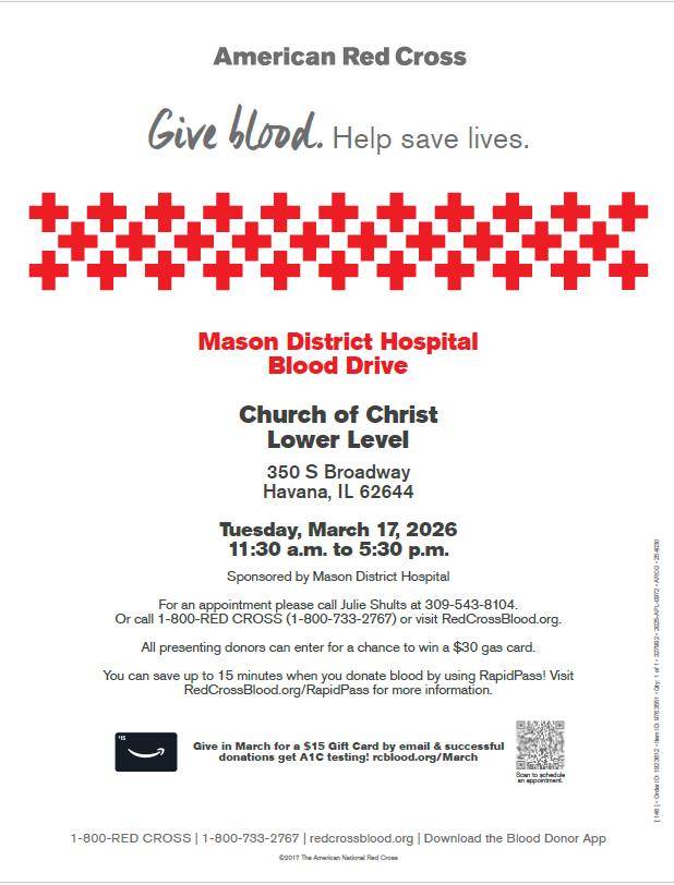 Give Blood. Help save Lives! Mason District Hospital with the American Red Cross is holding a blood drive at the Church of Christ, Lower Level, 350 South Broadway, Havana on Tuesday, March 17 from 11:30 a.m. to 5:30 p.m. For an appointment, please call Julie Shults (309) 543-8104.