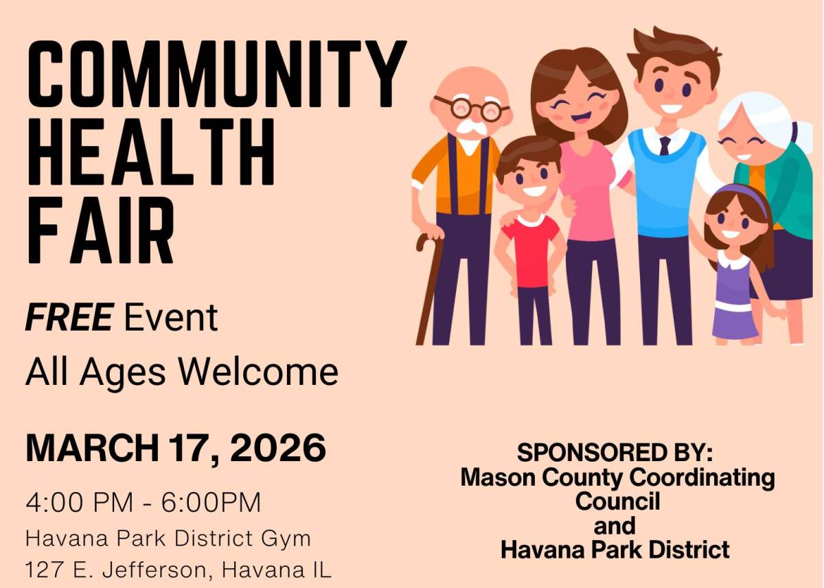 Mason County Coordinating Council and the Havana Park District are proud sponsors of the Community Health Fair. This is a free event, and all ages are welcome! The fair will be held Tuesday, March 17, 2026 from 4 p.m. to 6 p.m. at the Havana Park District Gym, 127 East Jefferson Street, Havana.
