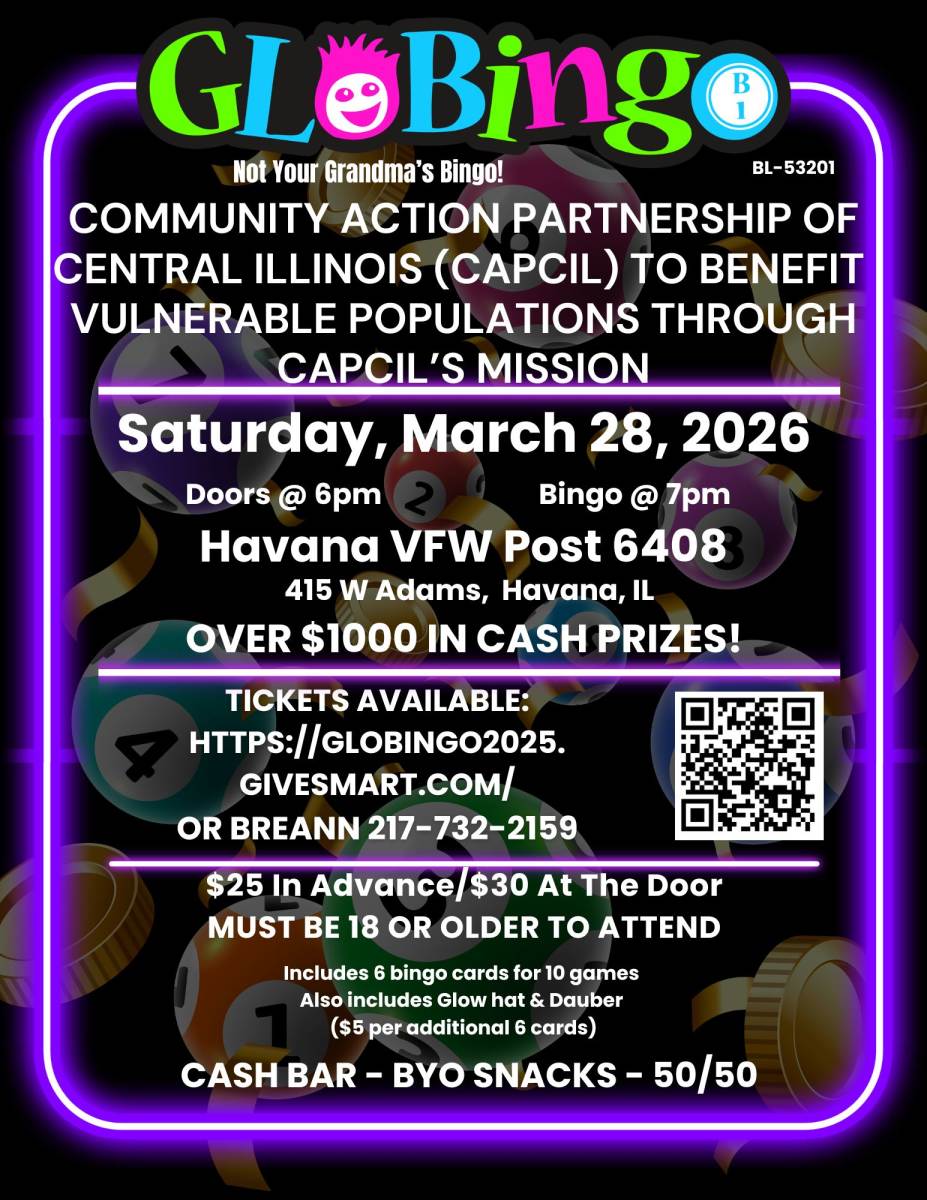Community Action Partnership of Central Illinois (CAPCIL) is sponsoring GloBingo at the VFW Post 6408, 415 West Adams Street, Havana on Saturday, March 28, 2026. Doors open at 6 p.m., Bingo at 7 p.m. Tickets may be purchased https://globingo2025.givesmart.com/ or call Breann 217 732 2159. Tickets are $25 in advance and $30 at the door. Must be 18 or older to attend.