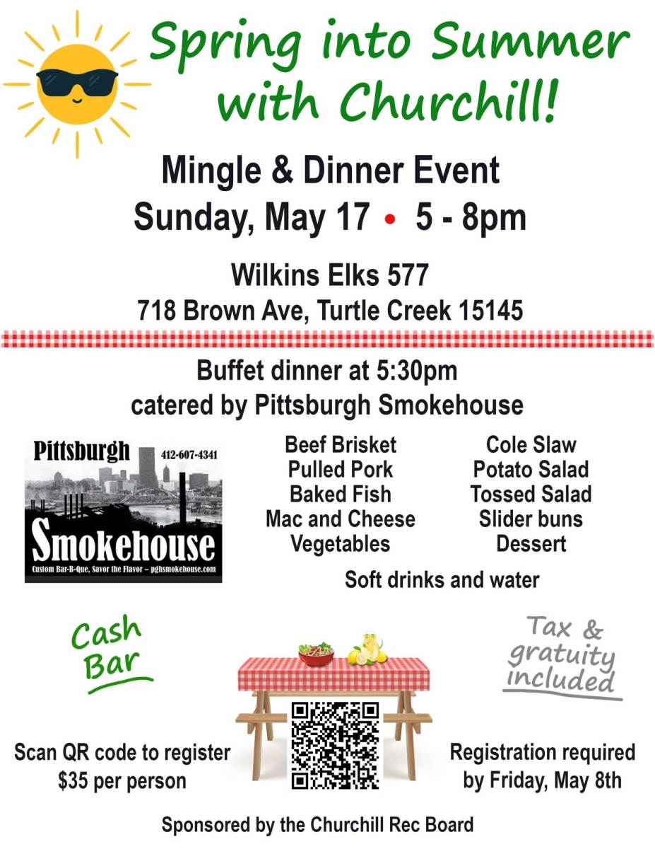 Join your family, friends, and neighbors on May 17th from 5-8 pm at the Wilkins Elks 577 Lodge for a mingle and dinner event. The theme this year is Spring into Summer with Churchill! The food will be catered by Pittsburgh Smokehouse BBQ. Visit the borough website for more information and to RSVP. Don't miss out! https://www.churchillborough.com/community/recreation-board/community-dinner