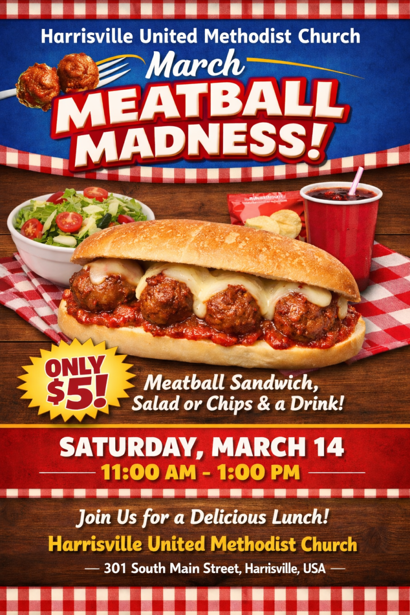The Harrisville United Methodist Church will be holding their March Meatball Madness Sale this Saturday, March 14 from 11:00 AM β 1:00 PM.