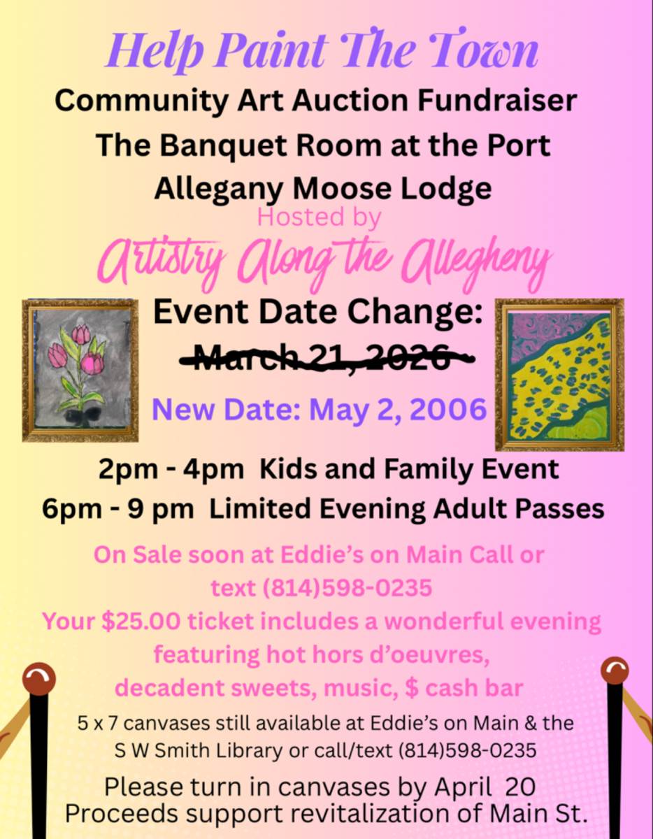 Artistry along the Allegheny will host a Community Art Auction Fundraiser in the banquet room of the Port Allegany Moose Lodge on Saturday, May 2, 2026. The Kids and Family Event will be held from 2:00 pm to 4:00 pm and the Adult Evening event will be from 6:00 pm to 9:00 pm. Canvas's are available at Eddie's on Main and the S.W. Smith Public Library and must be turned in by April 20, 2026. Tickets for the event are $25 and proceeds will support the revitalization of Main St.