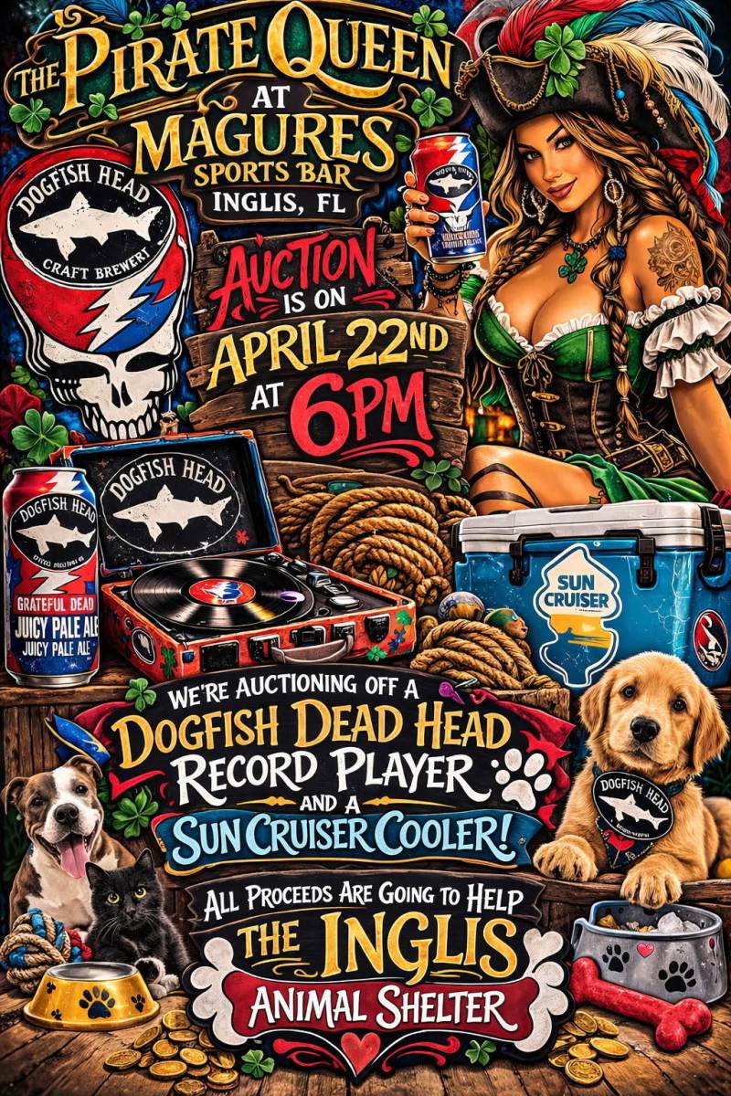 Magures is hosting a auction on April 22,2026 at 6:00pm they are auctioning off a Dogfish dead head record player! and a Suncruiser cooler! All proceeds go to help the Inglis animal shelter. Location is 48 Hwy 19 S Inglis Florida 34449