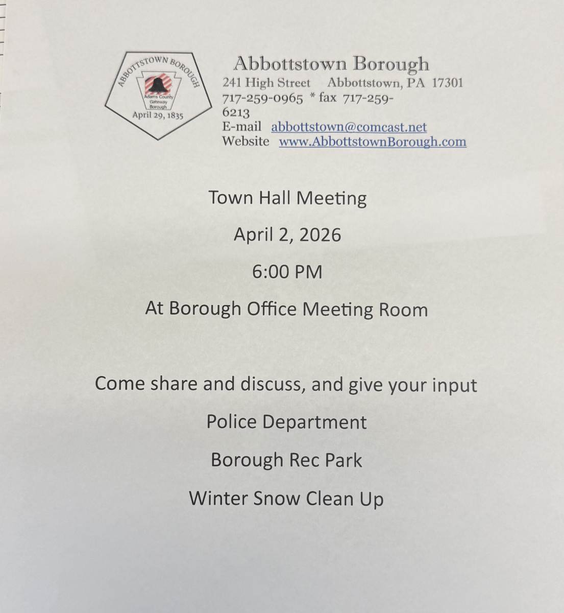 Abbottstown Borough will be holding its first public town hall meeting on April 2nd at 6pm in the borough office. We look forward to hearing from our residents on current and future ideas. These meetings will be held on the first Thursday of every month as needed