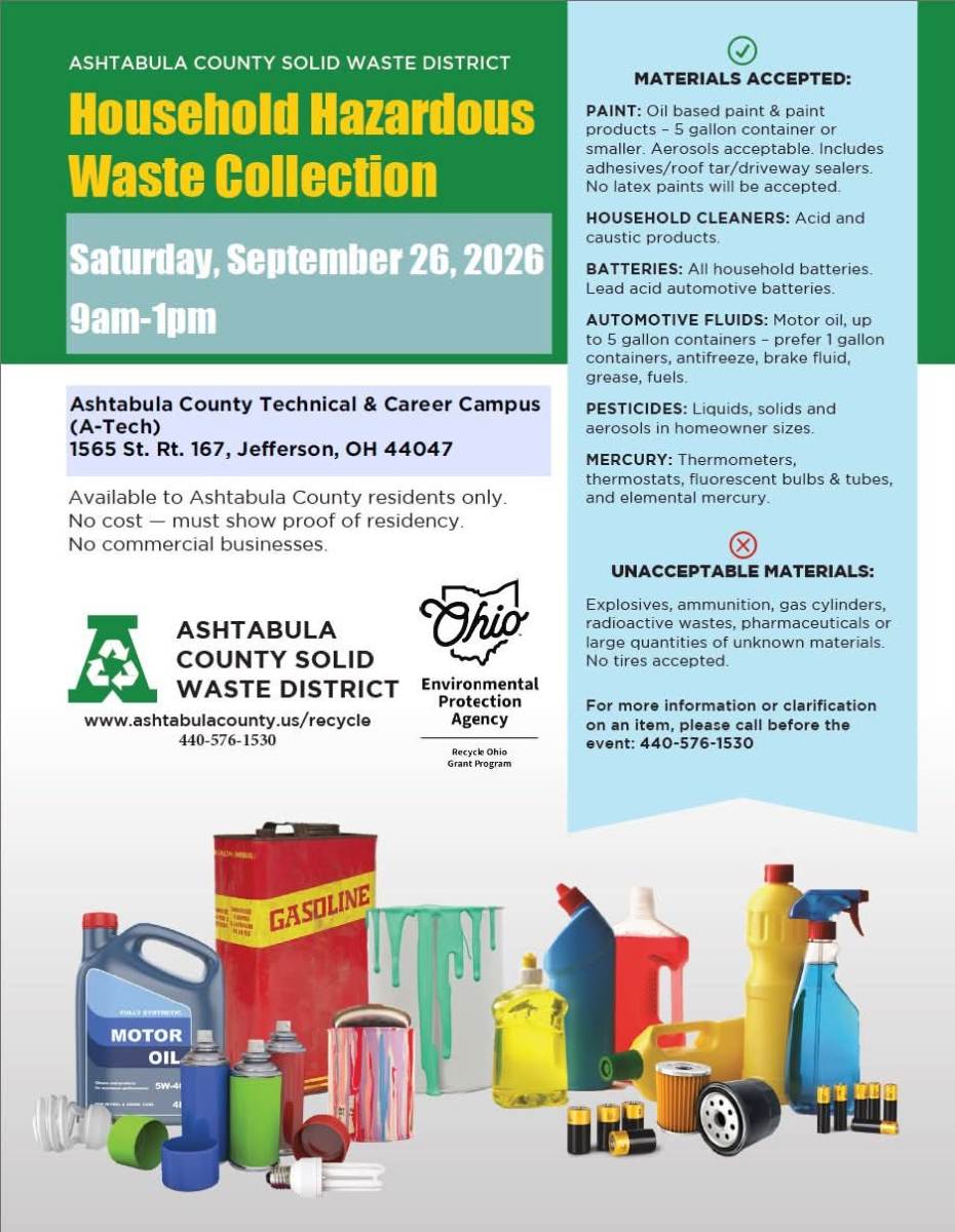 The Ashtabula County Solid Waste District will host their annual household hazardous waste collection event on Saturday, September 6th at the ATECH campus, located at 1565 State Route 167 in Jefferson. Collection will take place from 9am to 1pm.