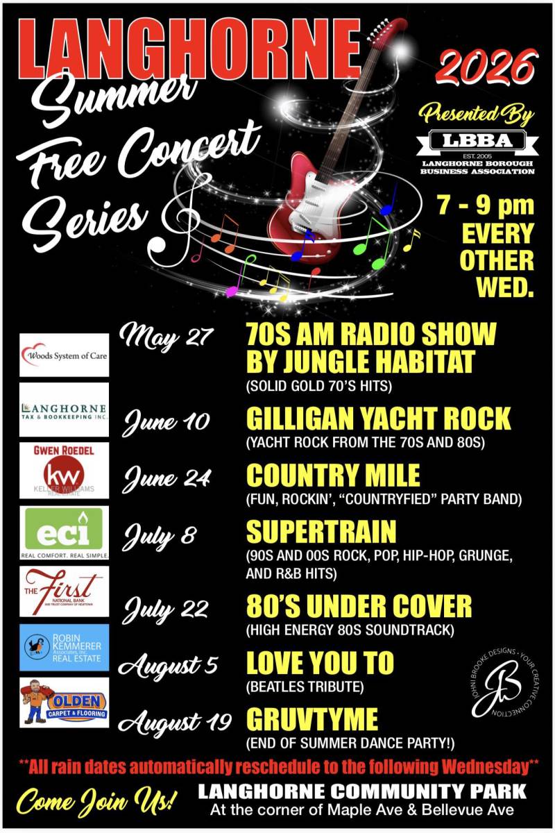 The Langhorne Borough Business Association's annual summer concert series is starting up in May! Starting on May 27 until August 19, a concert will be held every other Wednesday at the Langhorne Community Park behind the Richardson House from 7pm to 9pm.
