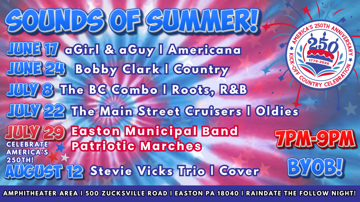 Join us for a special celebration of America’s 250th, featuring the "Easton Municipal Band" playing patriotic marches and food by Ezee Concessions! Wear your Red, White & Blue!! This free, BYOB event is perfect for all ages!