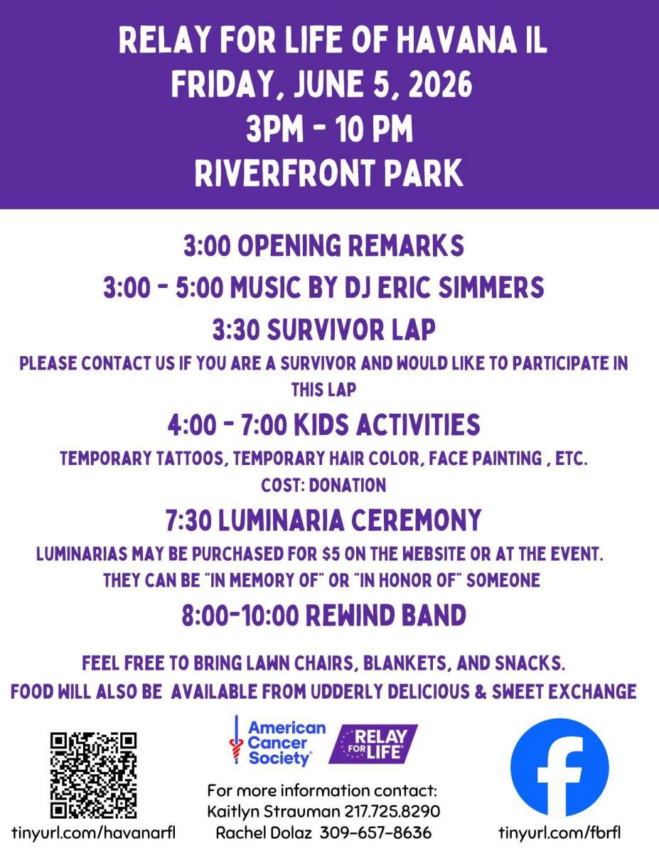 Relay for Life of Havana will be held on Friday, June 5, 2026 form 3 p.m. to 10 p.m. at Riverfront Park. This is an event to Celebrate Survivors; Honor those who have passed; Support those fighting now; Fund life-saving research! There will be live music, food trucks, luminaria ceremony, survivor lap and more!