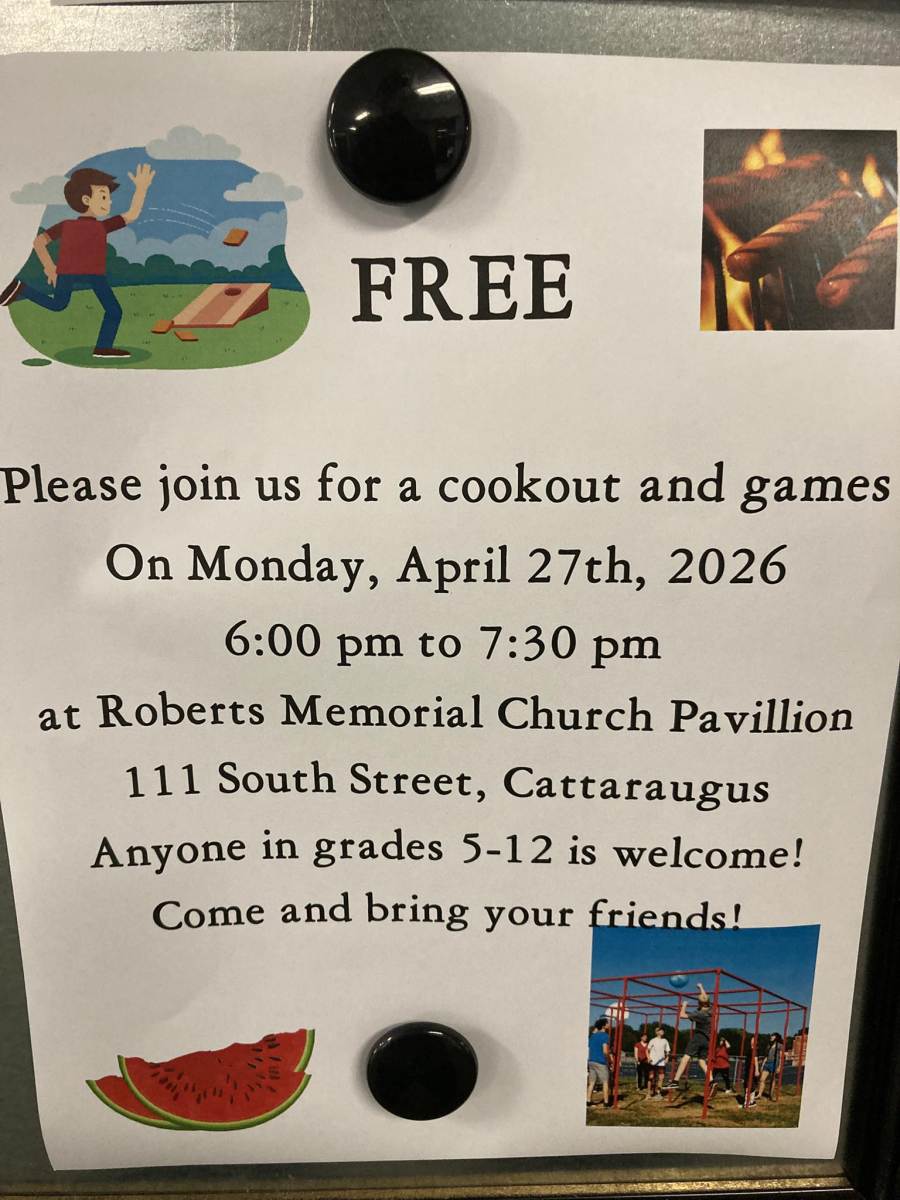 Hey, Cattaraugus community teens in 5th-12th grades, today is a great day for a cookout. Stop over at Roberts Memorial Church anytime between 6-7:30 for food and games at the pavilion!