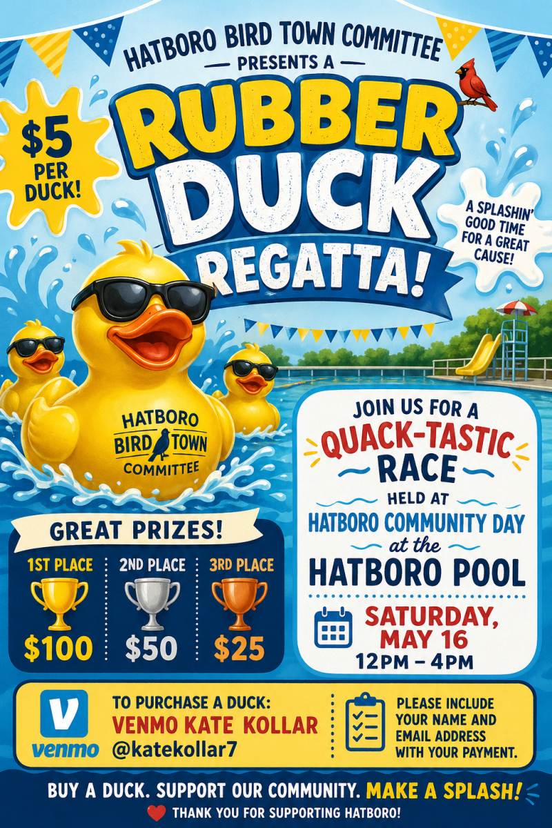 Join the Bird Town Committee for a Rubber Ducky Regatta at the Hatboro Pool! This event is taking place on Saturday, May 16, 2026 during the Community Day event from 12-4 PM. The Regatta will be taking place at the end of the event. Ducks will be available for sale at Community Day and in advance through the Bird Town Committee. Information on how to purchase a duck is included on the official flyer.