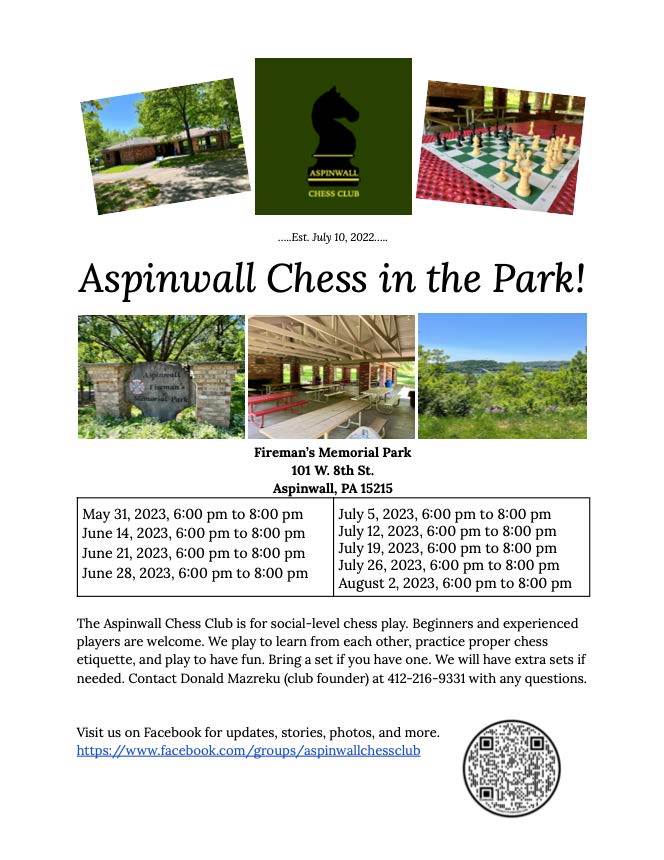 Visit us on Facebook for updates, stories, photos, and more. https://www.facebook.com/groups/aspinwallchessclub