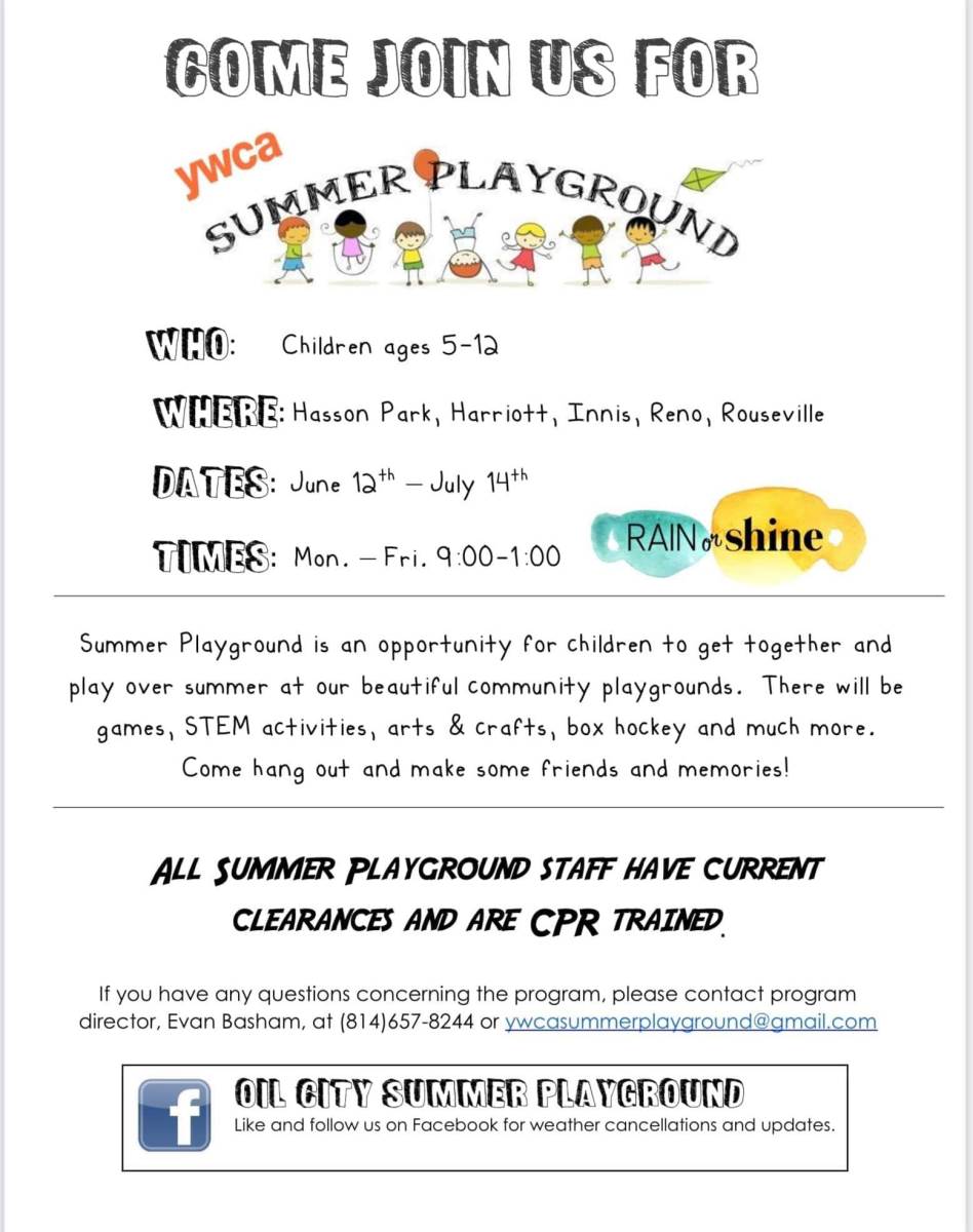Summer playground will run from June 12th through July 14th. The hours will be from 9-1 Monday through Friday.