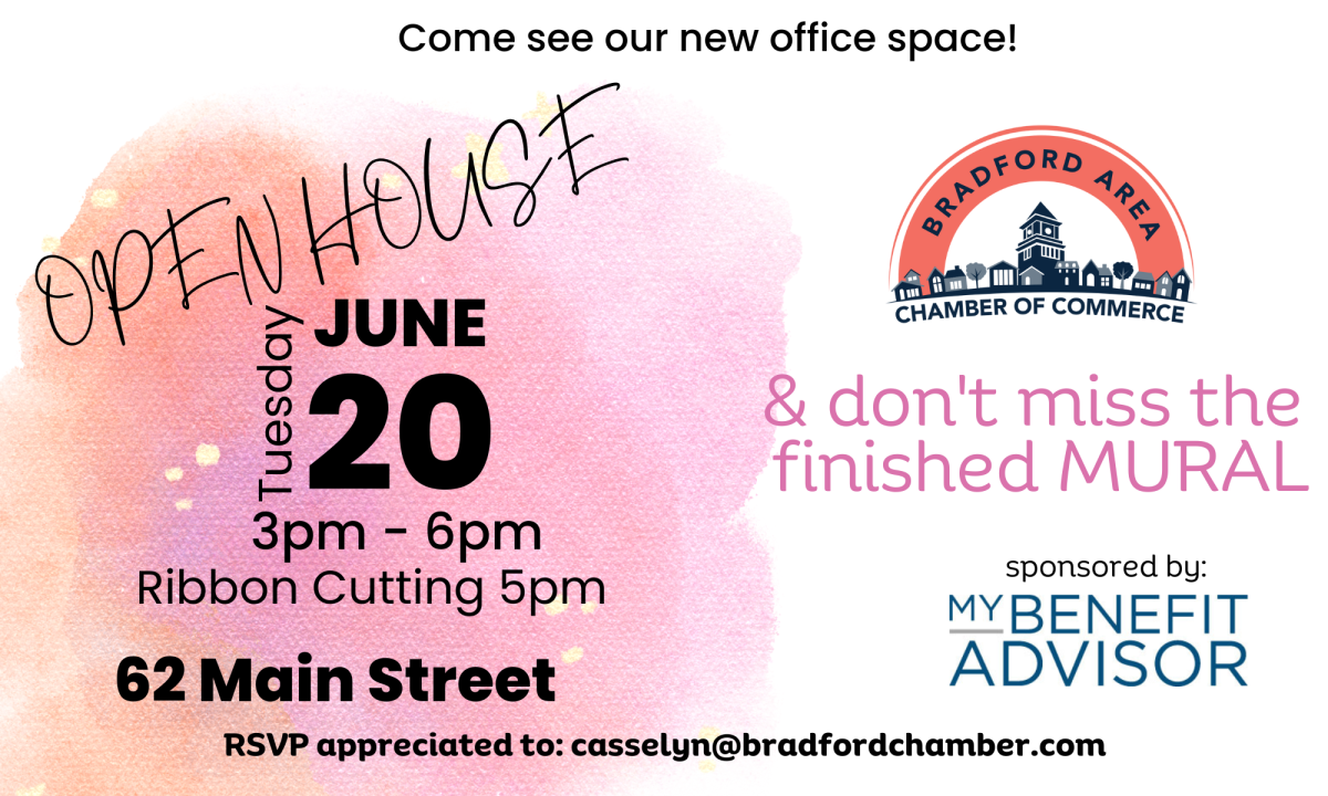 The Bradford Area Chamber of Commerce will hold an open house and ribbon cutting to celebrate their new location. Earlier this year the chamber moved to 62 Main Street, across from PNC Bank. The new facility is finished and ready to be shared with the community.