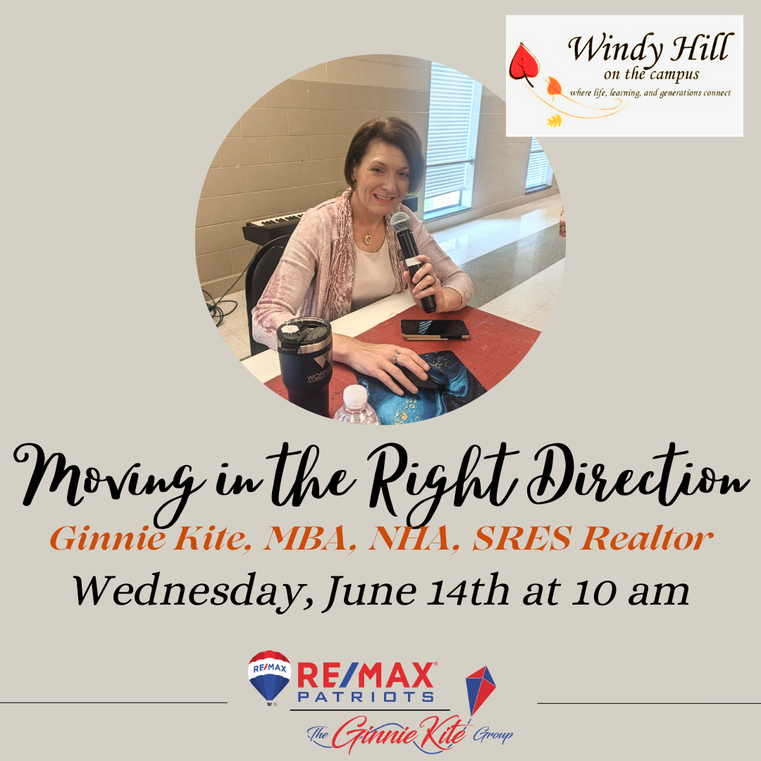 RE/MAX Presentation "Moving in the Right Direction" by Ginnie Kite. This presentation starts at 10 am at Windy Hill on the Campus (Senior Center)