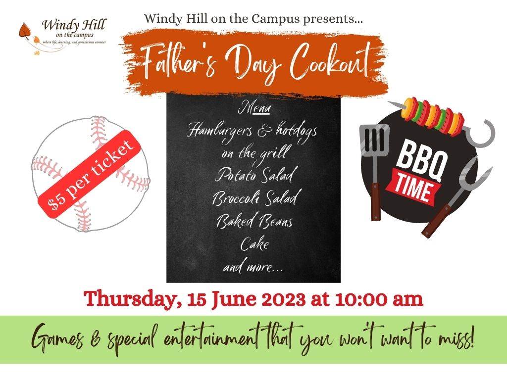 Father's Day event starting at 10 am at Windy Hill on the Campus (Senior Center). Tickets are $5 each and can be purchased at Windy Hill.